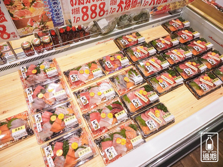 「海鮮工房田中」裡擺放著一盒盒精美的生魚片及握壽司,搭配夜間折價,絕對是帶回飯店當宵夜的最佳聖品。