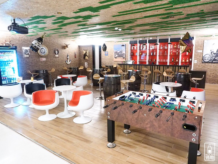 酒桶座位區,酒吧對面有個小舞台與一套鼓,可以當個小型Live House。