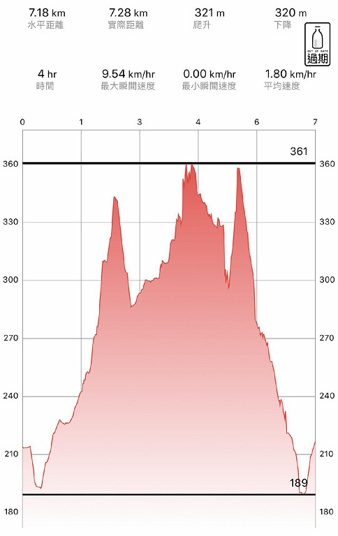 行徑距離約 7.2 公里,爬升約 320公尺,花費約 4個小時,由於當天步道前段路況泥濘,行徑速度較慢,加上沿途拍照、餵食小朋友補給品等,正常應該 3 小時可以完成喔。