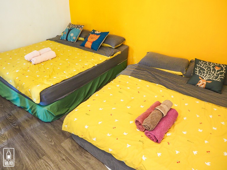 來看看房間的部分,我們是入住一館的四人房,有兩張雙人床墊,並準備好了浴巾,被套跟牆面配色有點怪,但抱枕還挺可愛的。