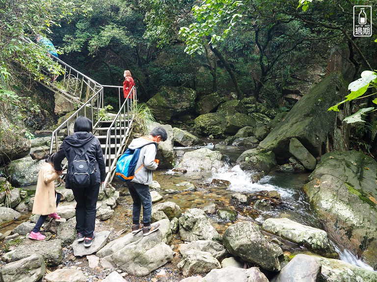 步道盡頭就是猴洞坑溪的小淺灘,溪水流速非常平緩,感覺很適合夏天來這裡戲水呢。