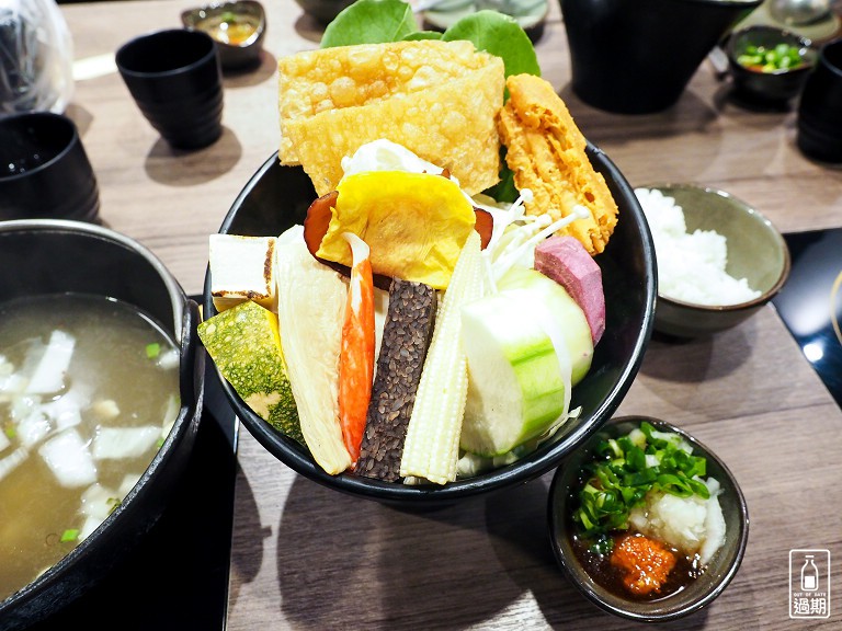 首先端上了基本菜盤,食材間擺放整齊且色彩繽紛,進一步仔細看,盤裡各項蔬菜都整理乾淨,份量也給的很足。