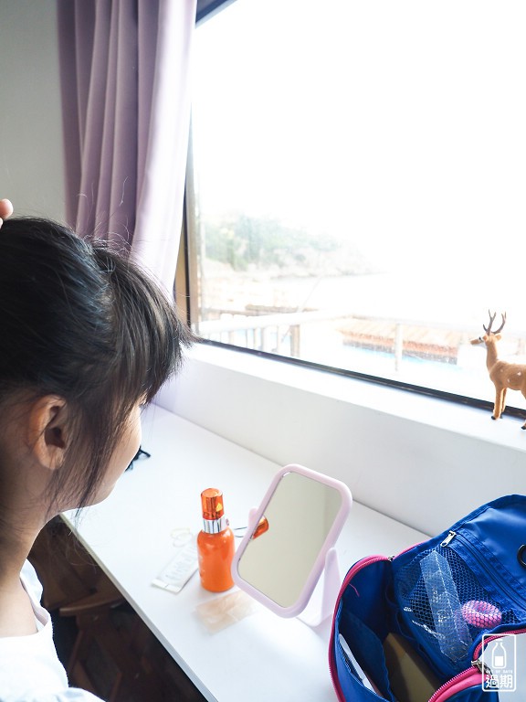 隔天退房前,妹妹在窗台前邊綁著頭髮,同時欣賞著美麗的海景第一排。