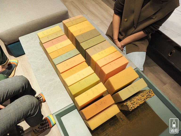 整個展間的沙發試坐了好幾輪之後, 品慈拿出了這組由各種泡棉組成的解說道具,除了請我們實際去按壓每款泡棉的軟硬度,還要觀察泡棉密度與軟硬程度的關係,沒想到單純的挑選沙發也搞得跟參加科學營一樣有趣。
